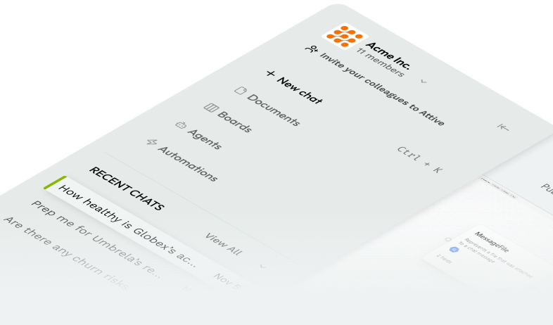 Attive unifies your CRM, emails, calls, and support tickets into one intelligent workspace. Ask any question about your accounts and get instant, accurate answers.
